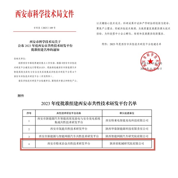 近日,西安市科學技術局發布通知,批準組建4個西安市共性技術研發平臺。集團所屬機械院牽頭組建的“西安市粉末冶金共性技術研發平臺”成功入選!