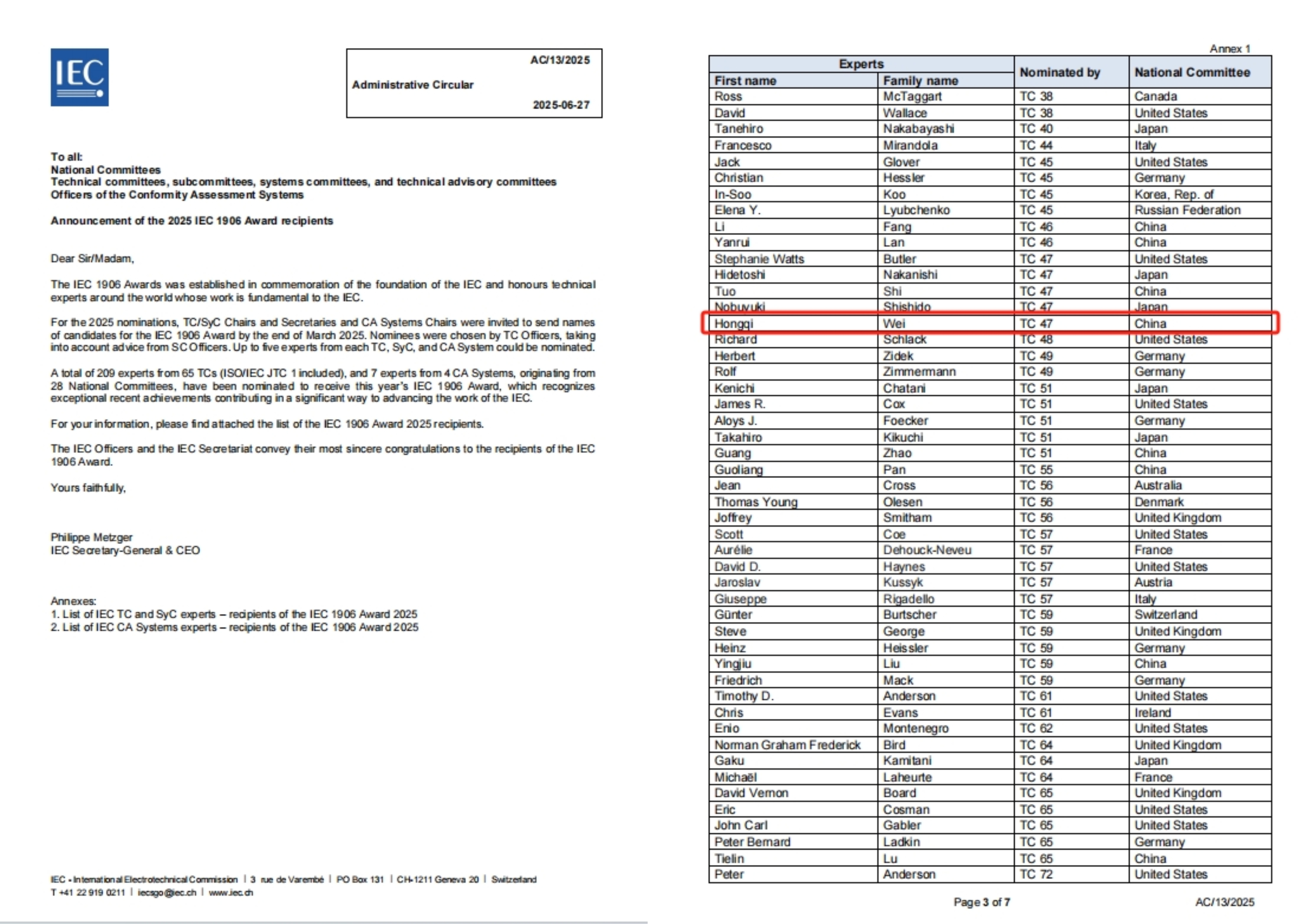 【概要描述】國際電工委員會(IEC)公布了2025年度“IEC 1906獎”獲獎名單,IEC/SC47E半導(dǎo)體分立器件分委員會專家、西安電力電子技術(shù)研究所有限公司教授級高級工程師蔚紅旗同志榮獲此殊榮。